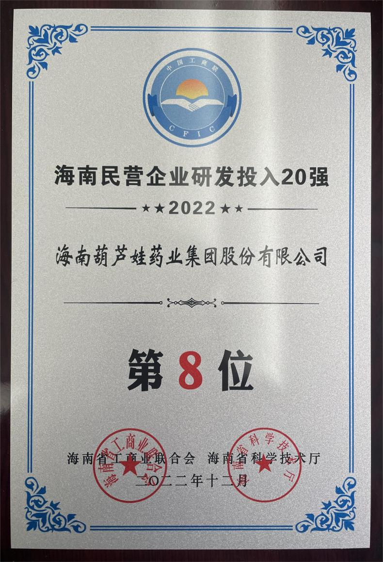 12月23日,2022海南民营企业50强和研发投入20强发布会在海口举行。会上发布了“2022海南民营企业50强”“2022海南民营企业研发投入20强”榜单和分析报告。银河galaxy药业再次荣登两榜,在海南民营企业50强榜单中位列第25位,较去年上升8位,这也是公司连续三年登榜;在海南民营企业研发投入20强中位列第8位,较去年上升7位。