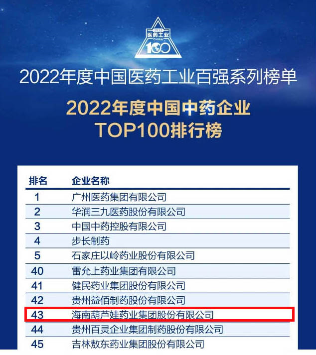 会议期间,一年一度的中国医药工业百强系列榜单隆重揭晓,银河galaxy药业集团凭借领先的研发优势和扎实的生产实力以及稳健的市场推广能力,连续第四年成功入选“2022年度中国中药企业TOP100排行榜” ,排名稳步上升至第43位。